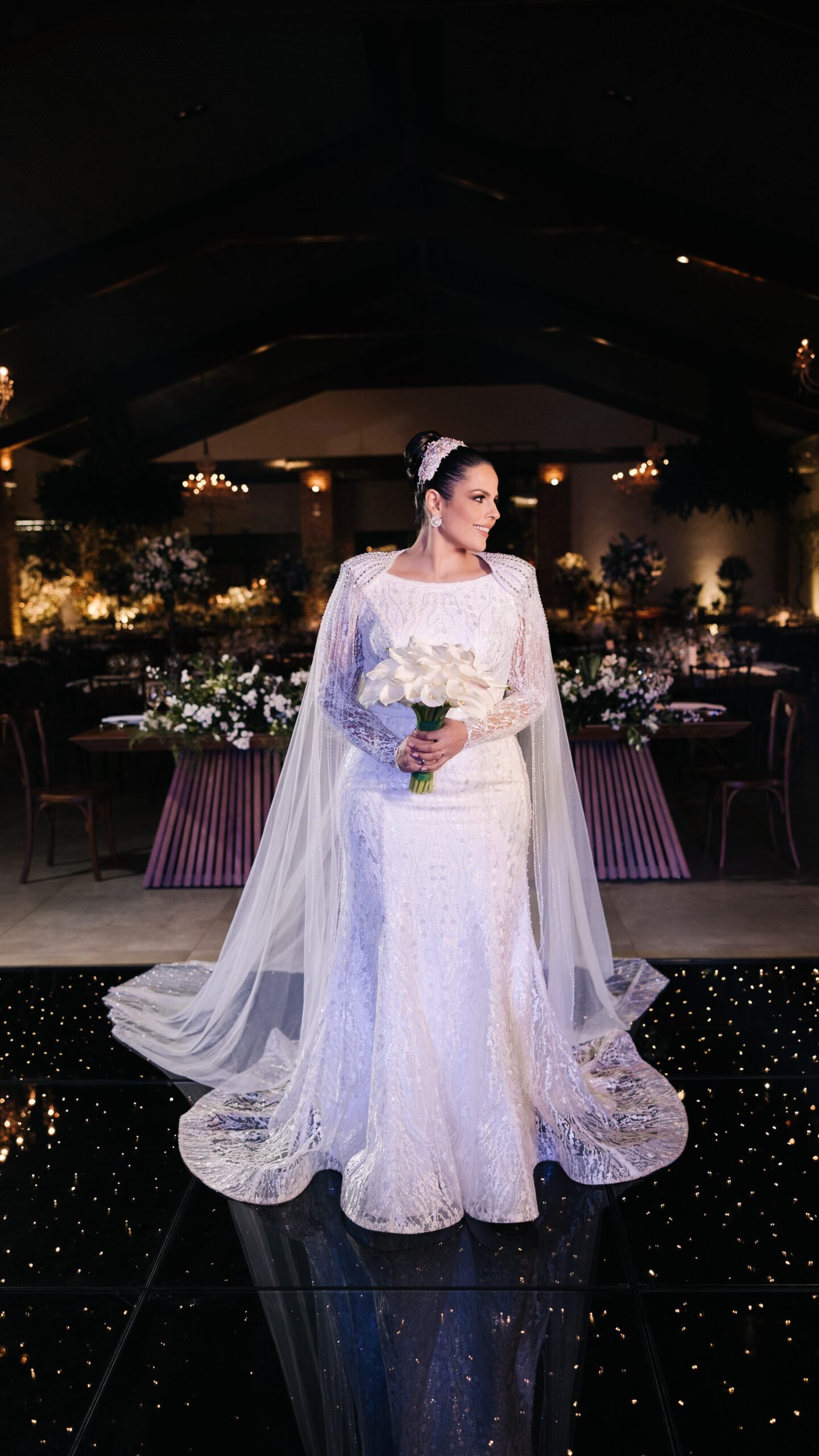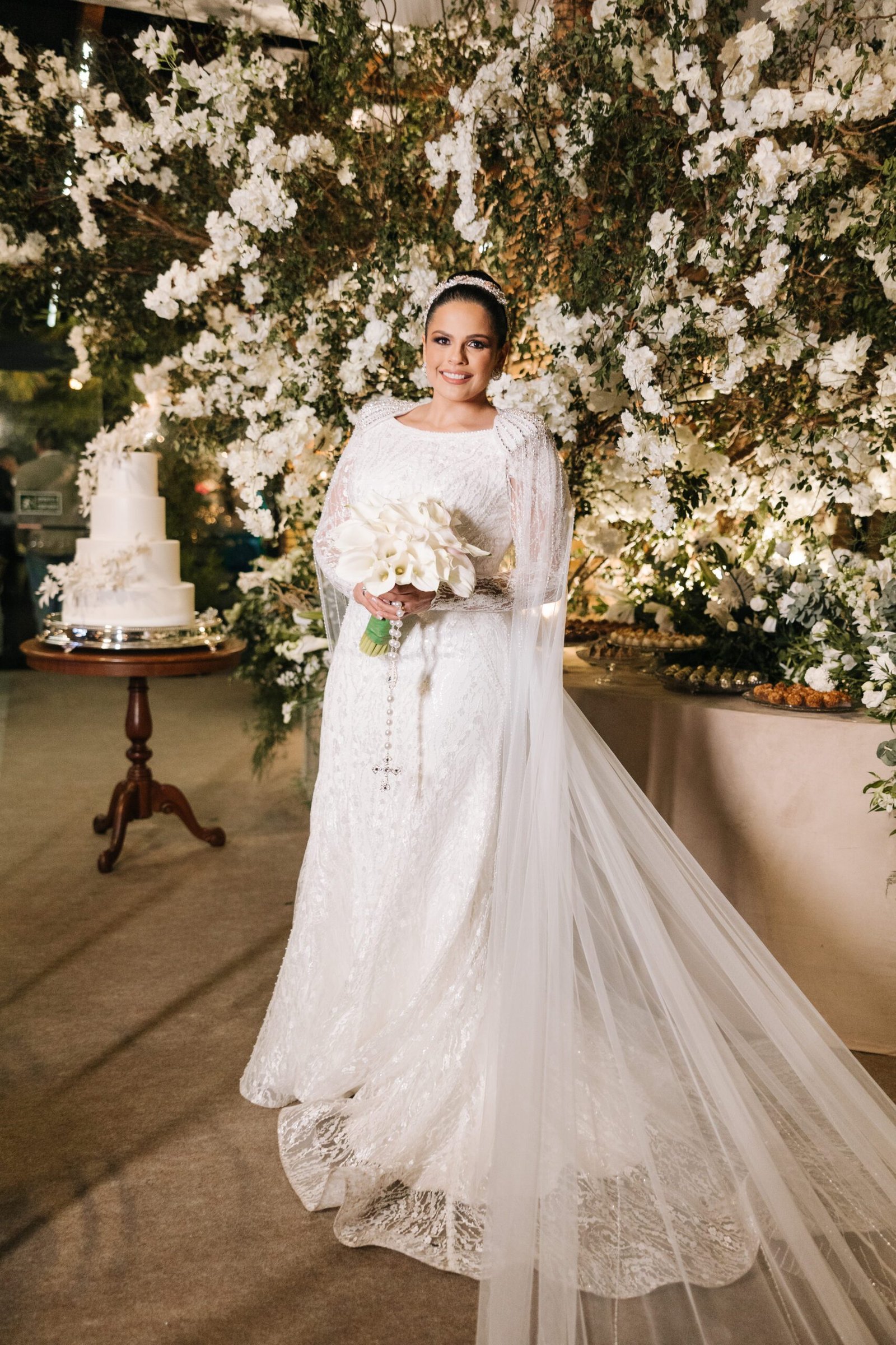 Na ocasião, Aline vestiu uma peça de modelagem sereia com bordados até os pés e uma linda renda cobria os braços. A capa de tule, com detalhes bordados nos ombros, concluiu a perfeição deste vestido de noiva que transmite glamour e um toque sutil de grandeza à noiva.