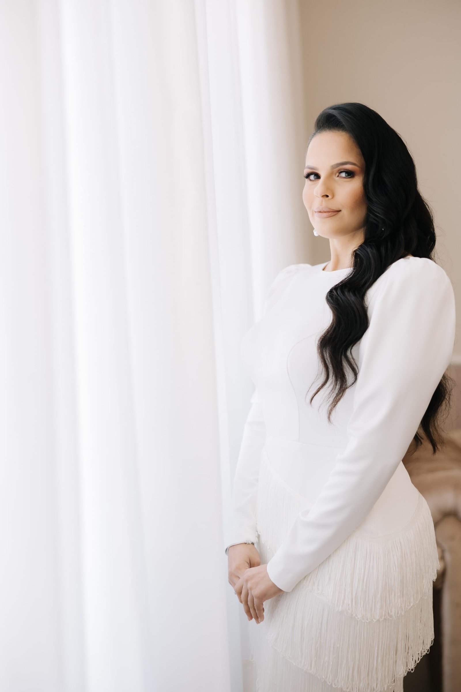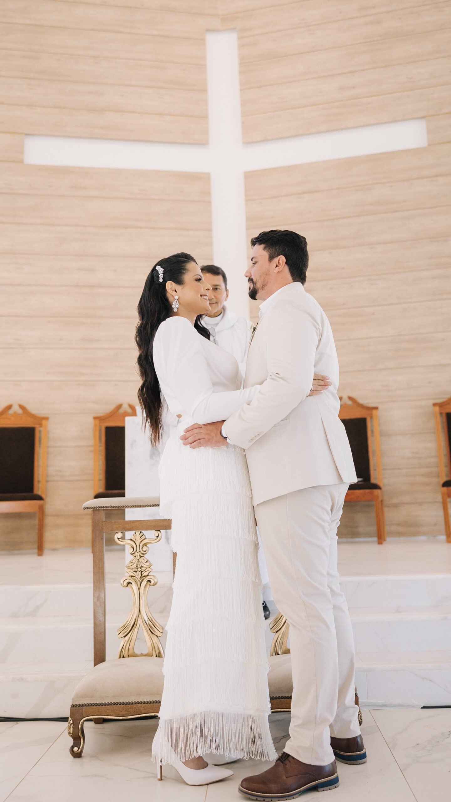 Para o casamento religioso, Aline escolheu um vestido exclusivamente criado e produzido para ela, de modelagem justa e imponente. A peça de estilo moderno tem mangas longas com volume nos ombros. A saia atrai todos os olhares por suas franjas em camadas e o decote nas costas garante o equilíbrio ideal na composição deste lindo vestido.